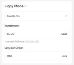 This mode means that the volume of your copy trade is identical to your pre-set value. For example, if you input 0:01 lots per order, your copied volume will be 0.01 lots, matching the original strategy.