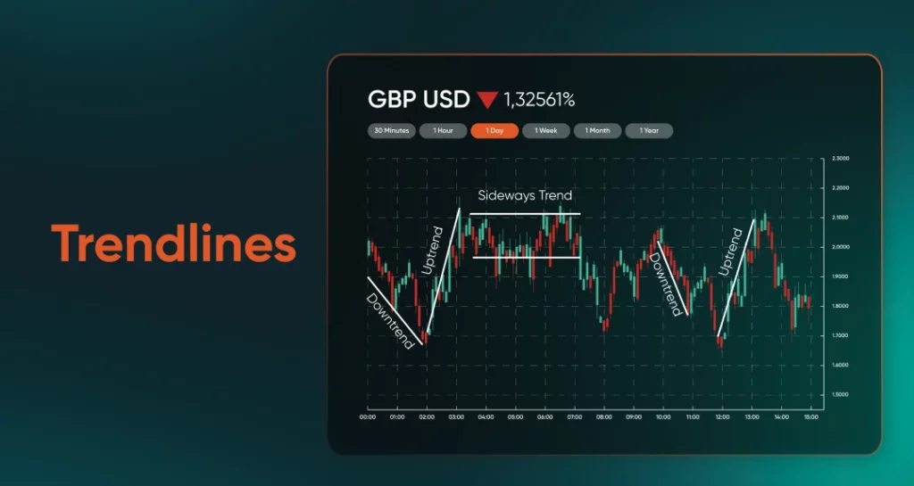 Besides charting uptrends, downtrends or sideways trends, trendlines are also useful for visualising levels of support and resistance.