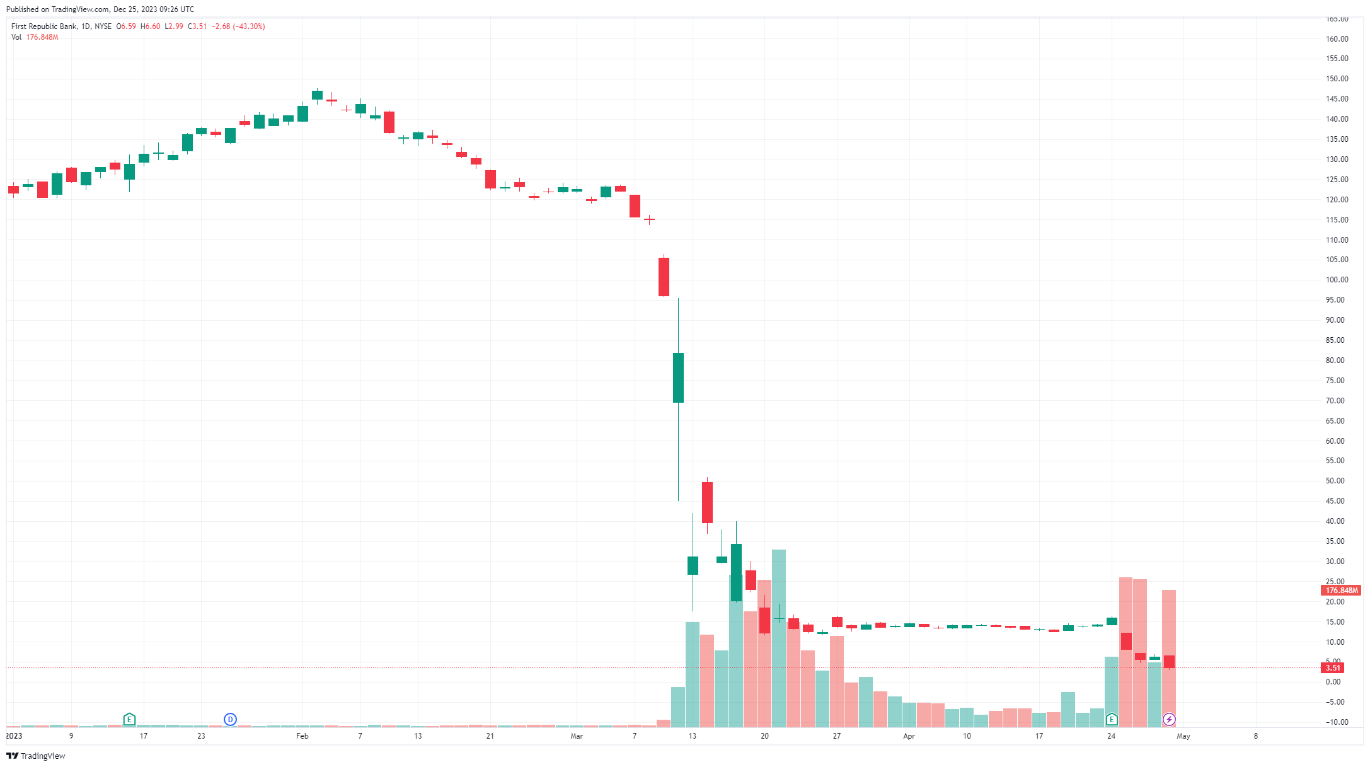 This event had a ripple effect; shares of First Republic Bank plummeted as investors sought to reduce exposure to institutions similar to SVB. The downward trend persisted, with the company’s shares continuing to drop nearly 50% to a record low of $12.18 on 20 March [6]. In April 2023, First Republic reported a 40% drop in deposits for the first quarter’s financial reporting, leading to a further decline in its stock price to $8.10 and extending its year-to-date losses to over 90% [7]