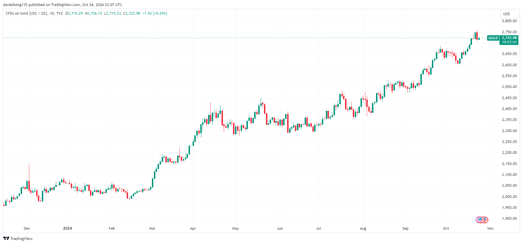 There have been several bullish drivers throughout this period, including the risk of fiscal instability and uncertainties surrounding the US presidential election to its safe-haven appeal amid heightened geopolitical tensions, and de-dollarisation. And now also rate cuts—not just by the Fed, but by other central banks as well—have reduced the cost of holding non-interest-paying investments in gold.