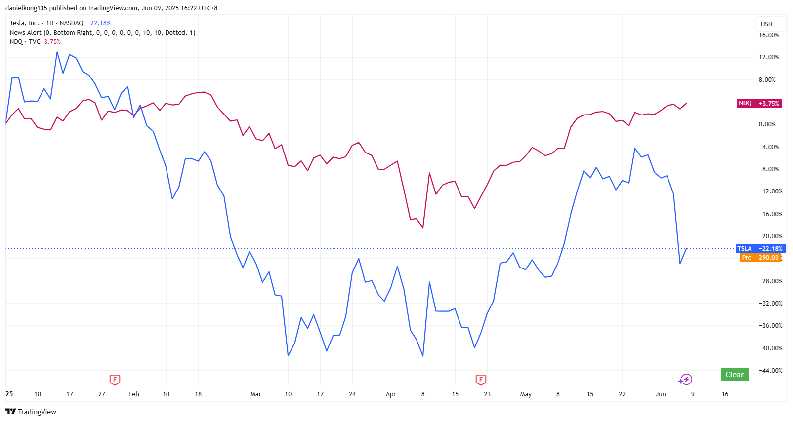 As of early June 2025, Tesla’s shares have significantly underperformed the broader tech market. Year-to-date, Tesla shares are down 22.09%, while the Nasdaq 100 (NDX) is up 3.75% over the same period.
