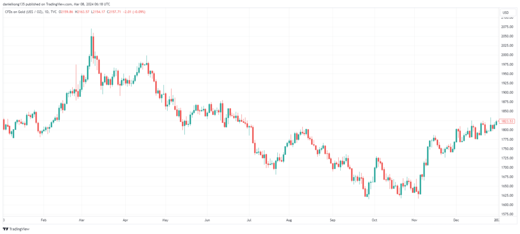However, the commencement of the Fed’s rate hiking cycle in March 2022 saw a decrease in gold prices.