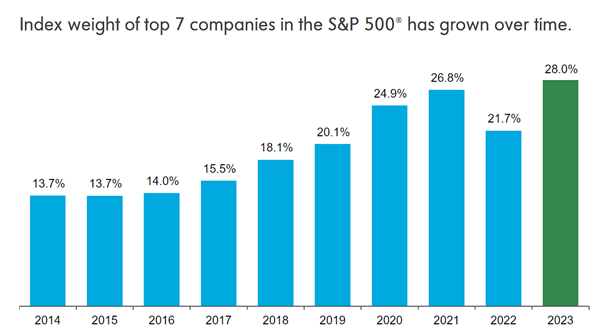 While only seven in number, the Magnificent Seven nonetheless have an outsized impact on the S&P 500. In 2023, these seven stocks contributed an eyebrow-raising 70% of the S&P 500’s gains.