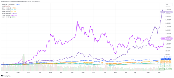That the Magnificent Seven stocks are some of the largest stock market winners today is no exaggeration. Here’s how these seven stocks have performed over the past 1- and 5-years duration (as at June 2024).