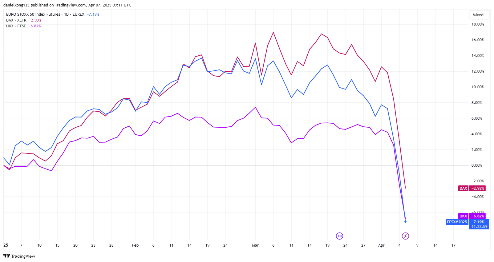 European markets opened sharply lower on 7 April, extending last week’s steep losses as Trump’s tariffs fuelled investor fears. At one point, Euro Stoxx 50 futures fell over 6%, extending an 8% decline from the previous two sessions. Germany’s DAX index, heavily exposed to global trade, plunged 10% at the open, while France’s CAC 40 fell 6.6% and Italy’s FTSE MIB slid 5.7%. In the UK, the FTSE 100 shed 6%, to a one-year low of 7,566.