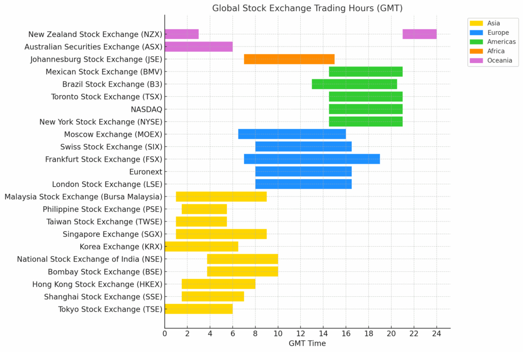 While the earlier table provides a full overview of global trading schedules, it can also be helpful to view key exchanges by region. This breakdown highlights when major markets open and close locally, giving a clearer picture of how each trading session fits into the 24-hour market cycle.