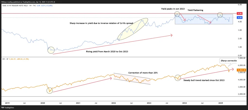 However, the relationship between the 10-year yield and the S&P 500 Index isn’t always linear. For instance, during the 2020-2022 COVID-19 period, both moved in tandem due to near-zero interest rates and the Fed’s QT measures, which dampened interest in Treasuries.