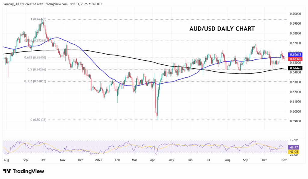FX: USD built on the Fed’s hawkish cut and positive Trump-Xi meeting as the index tested resistance at the swing high from August at 100.25. Odds of a December rate cut remain around 70%. We get to hear from an unusually divided FOMC this week with 12 (mainly dovish) officials due to speak, with Daly, Cook and Goolsbee all sharing mixed views. Ordinarily, focus would be on Friday’s US monthly employment report, but the government shutdown means that won’t be published. It looks very likely to extend beyond the 35-day record set in 2018/19 which could also start to weigh on USD sentiment.