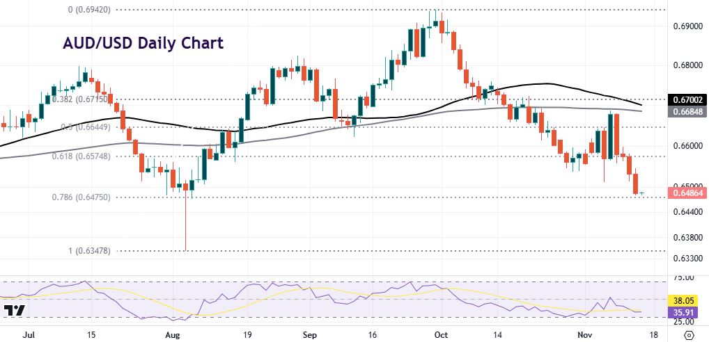 This month so far, the aussie is actually outperforming all of the other currency majors versus the dollar apart from the loonie. That is because the RBA remains one of the hawkish outliers amongst central banks. The central bank recently kept its policy rate unchanged at 4.35%. Underlying inflation (3.5% Y/Y in Q3 2024) remains too high and isn’t expected to sustainably return to the midpoint of the 2-3% inflation target range until 2026. That means the first rate cut isn’t fully priced in until the second half of next year.
