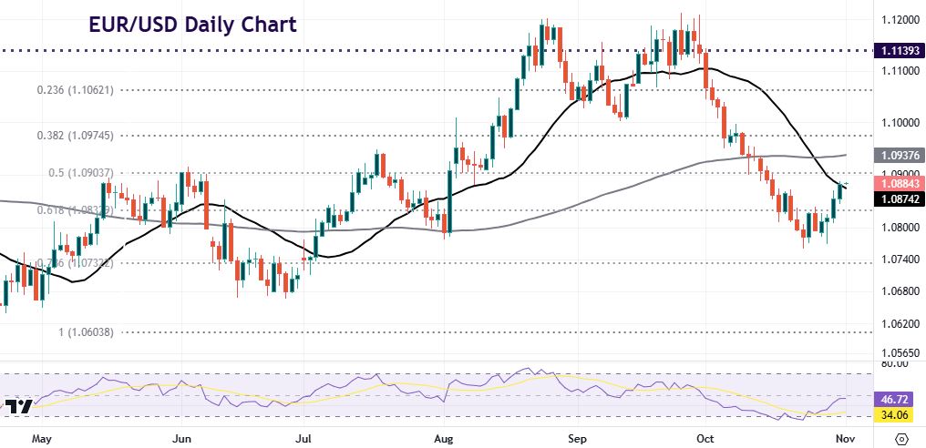 EUR was firmer for a fourth consecutive day following firmer-than-expected inflation data. Price moved up to the 21-day SMA at 1.0874. Eurozone CPI rose 2.0%, a little above the forecast 1.9% and September’s 1.7% print. The data helped sway market pricing further towards a 25bps ECB cut in December with 29bps of easing now priced in, versus 31bp previously.