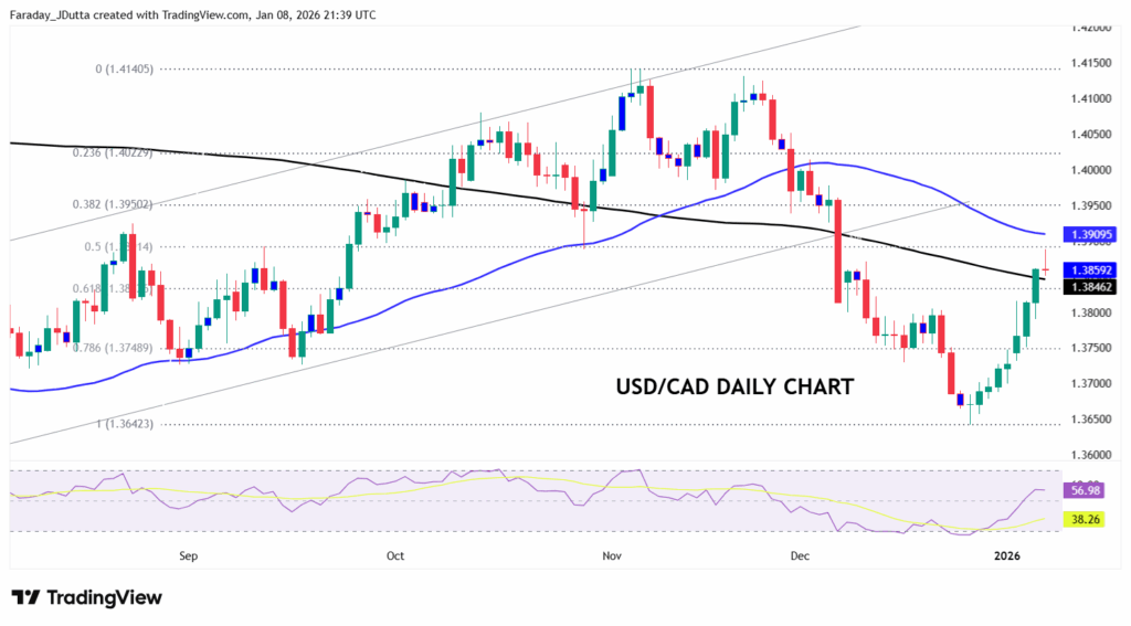 The Canadian dollar is the worst-performing currency in the G10 since the weekend. Markets have been weighing an increased supply of Venezuelan oil in the future, which would disadvantage Canadian heavy, high-sulphur crude, which had been trading at a premium during Venezuela’s supply glut. The loonie is also having to negotiate the risks of USMCA renegotiation with major uncertainty potentially impacting the economy. That means increasing risk that the Bank of Canada may have to cut again in 2026. The major has bounced sharply after hitting a 6-month low over the holiday period. Resistance lies in the upper 1.38s which is the 50% retracement of the November/December USD decline and a major low from late October. The USD advance has cleared the 200-day SMA, with the 50-day SMA at 1.3909 in sight after nine straight days of gains.
