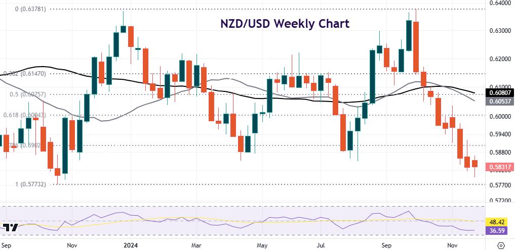 External drivers and the strong US economy and USD will likely continue to drive the major. Trump’s protectionist stance has hurt the kiwi already. Prices broke down through the previous year-to-date lows around 0.5855. The October 2023 bottom at 0.5773 is the next key level of support.