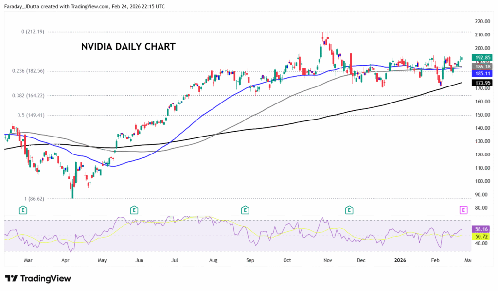 Options markets predict NVDA could move 4.8% in the trading session after the release. The stock has risen 18x in the three years since ChatGPT went public in late 2022. But it has stalled lately (+2% in 2026) and is in the bottom half of the Mag 7 over the last six months. Prices have traded in a range for some time between $164 and $195 with the upside breakout to the record high at $212.19, the only major move. Otherwise, prices have traded around the 50-day and 100-day SMAs at $186.16/17 in recent weeks. The 200-day SMA sits at $173.95 while initial resistance resides just below $195.
