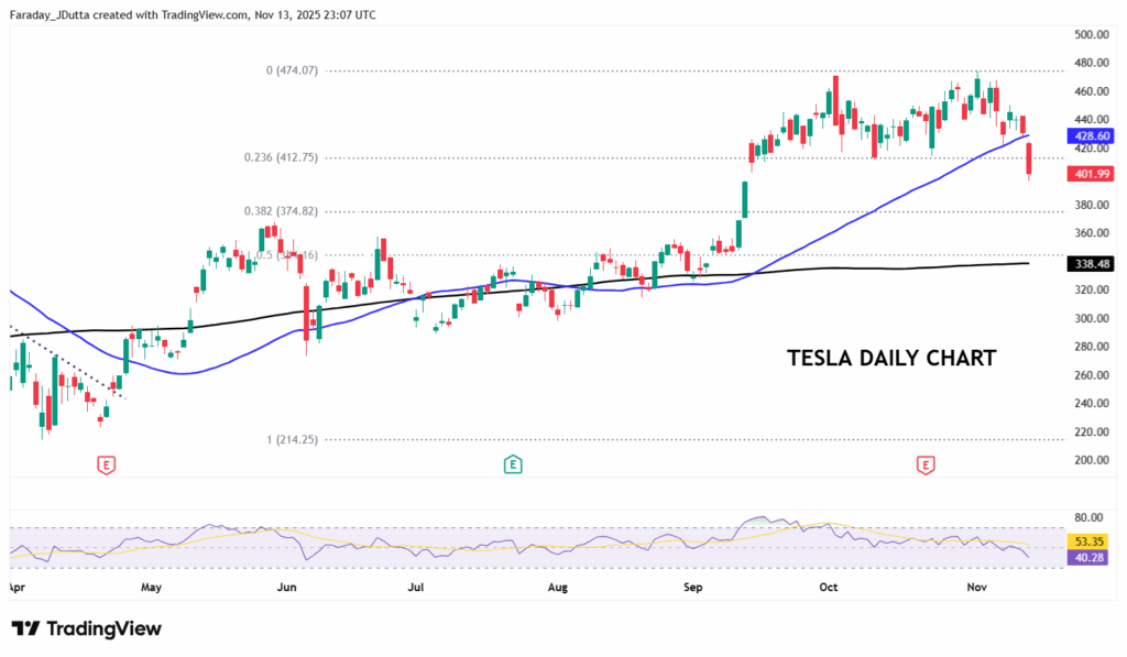 Tesla suffered its biggest one-day percentage drop since July 24, the session after the company reported Q2 earnings and CEO Elon Musk mentioned to investors nine times that future quarters would be ‘rough’. The stock is now down nearly 10% in the last three sessions, and -0.5% on the year making it the only Mag 7 in the red. There’s been various negative news stories in recent days including the leaders of the Cybertruck, Model 3 and Model Y programs all leaving. A recall of a battery unit after complaints very recently dampened the mood, with more broadly disappointing China sales numbers in focus. Major bull Cathie Wood also trimmed her ARK holding. Prices have broken down through the 50-day SMA at $428.60. The last time they did this decisively was in late January when the stock fell below $225. The next major Fib level (38.2%) of the April to November high is at $374.82.