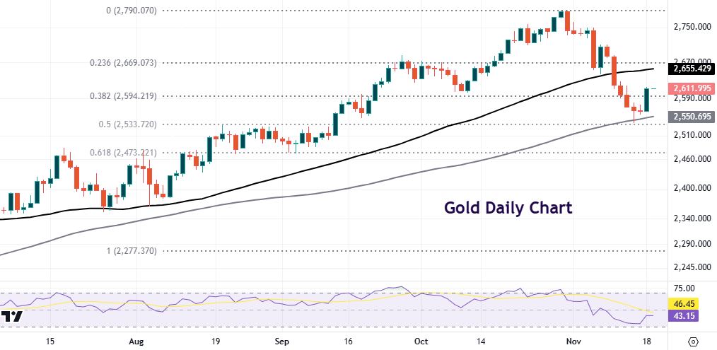 ETFs saw their biggest outflows since May in early November. Money has been switched into bitcoin, which is attrating haven flows normally seen in gold. The clear cut election win has taken uncertainty out of the market. The surging dollar likely also dampens demand from central bank buying which has been a big driver of prices. The 50% mark of the June rally is at $2533. The 100-day SMA is just above at $2550 with the 50-day SMA at $2655.