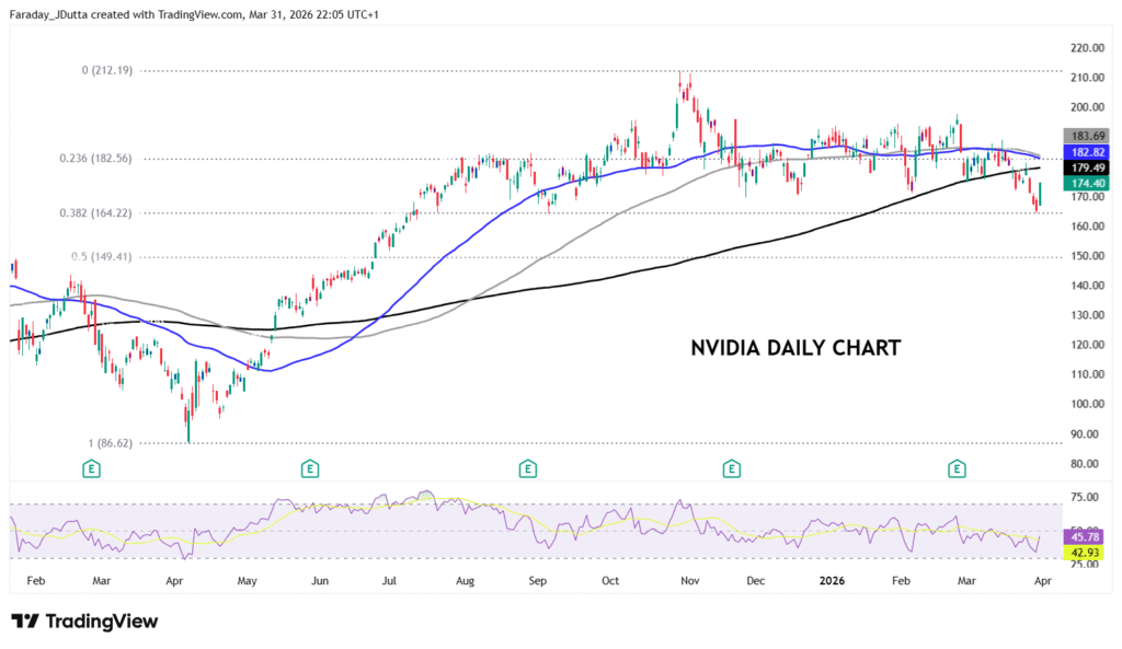US stocks: The S&P 500 jumped 2.92% to close at 6,529, the Nasdaq was 3.43% higher at 23,740 and the Dow Jones settled higher by 2.49% at 46,341. Wall Street enjoyed its best day since May on the potential Middle Ease de-escalation. That said, the relief rally failed to erase volatile March with a 5.3% drop in the S&P 500 representing its worst monthly performance since 2022. Communication Services topped the leading sectors, up 4.41%, with Technology rising 4.24%, Consumer Discretionary up 3.27% and Industrials up 3.23%. The only sectors in the red were Energy and Utilities. Nvidia partnered with Marvell on AI infrastructure and silicon photonics with NVDA investing $2bln in MRVL. NVDA jumped 5.6%, Marvel soared 12.8%. Meta gained 6.7% after it said it was adding Instagram Plus and $499 Ray-Ban glasses. Nike reported profit declines after the close as weak demand in China dragged on. The stock was down 3%.