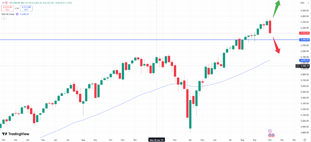 The S&P 500 index might weaken further. As the chart above shows, the current “dent” in the uptrend might cause a bigger slide in markets for now. Yet, nothing much had happened so far. The price had not event gone below the opening price of last month. In general, though, we also pointed out before the usually the month of September has led to falling prices and the current action of the Trump administration might just be the trigger now. The news might furthermore not even be released this week, due to the ongoing shutdown in most parts of the US administration. The tentative date would be Thursday, 16h October.