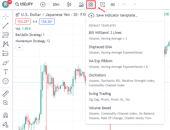 Template chart adalah cara yang Anda inginkan untuk mengatur bagan dan dasbor setiap kali Anda membuka platform. Ini berguna saat Anda ingin bagan Anda dibuka dalam gaya tertentu setiap saat dengan instrumen tertentu yang dapat diakses dengan sekali klik.