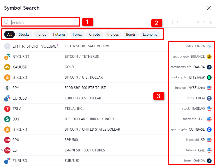 Anda dapat mencari simbol yang ingin Anda lihat dengan mengklik pencarian simbol di sudut kiri atas dasbor