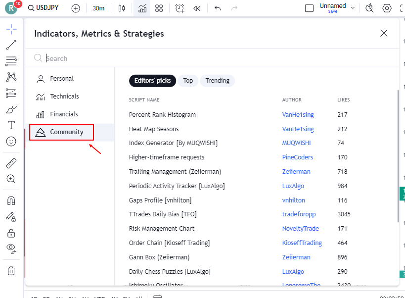 Tab komunitas menampilkan indikator khusus yang dikembangkan oleh pengguna TradingView.