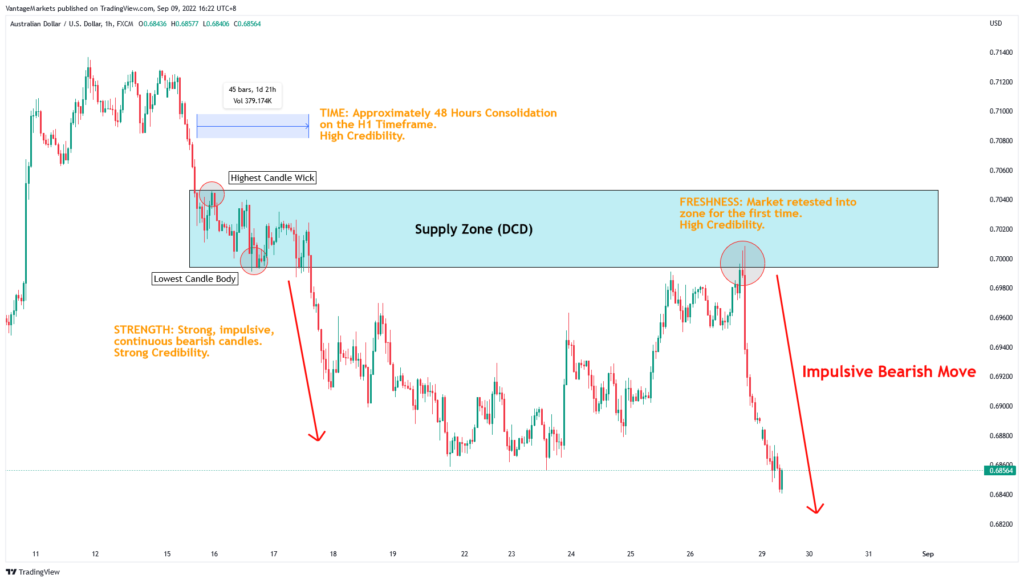 Pada Gambar 11, grafik menunjukkan contoh penjualan. Zona penawaran yang ditandai dengan warna biru memenuhi ketiga hukum penawaran dan permintaan. Pada grafik H1, konsolidasi berlangsung selama kurang lebih 48 jam dengan pergerakan bearish yang kuat menjauh dari zona tersebut, dan ini adalah kali pertama pasar memasuki zona penawaran tersebut.