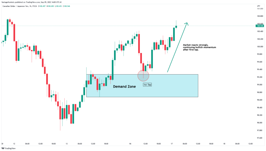 Gambar 9 – CADJPY H1 “Kebaruan: Pertama Kali Masuk ke dalam Zona” (https://www.tradingview.com/x/uG5kHaLN/)