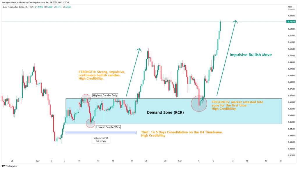 Gambar 13 – EURAUD H4 “Contoh Trading di Zona Permintaan” (https://www.tradingview.com/x/g6EVtVoI/)