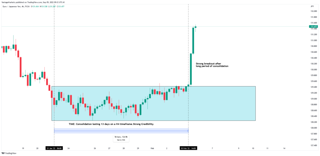 Pada Gambar 5, konsolidasi berlangsung selama 13 hari pada kerangka waktu H4 dengan terjadinya breakout bullish yang kuat setelahnya.