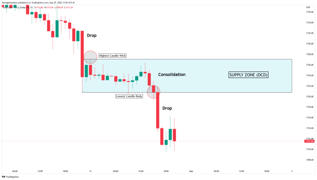 Untuk menggambar zona penawaran, seseorang harus terlebih dahulu mengidentifikasi kondisi pasar yang sedang terjadi. Seperti yang disebutkan di atas, seorang trader ingin menjual di zona penawaran. Zona penawaran dapat ditemukan pada struktur pasar RCD dan DCD dan digambar dari sumbu tertinggi hingga tubuh candle terendah dalam konsolidasi [4].