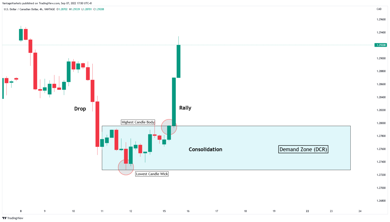 Gambar 3 – USDCAD H4 “Cara Menggambar Zona Permintaan DCR” (https://www.tradingview.com/x/eqadshom/)