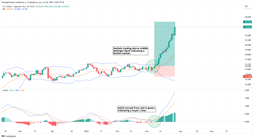 Gambar 10 menunjukkan pasar USDJPY bergerak bullish, yang ditandai dengan pasar trading di atas garis tengah Bollinger Band dan MACD yang berbalik dari merah menjadi hijau.