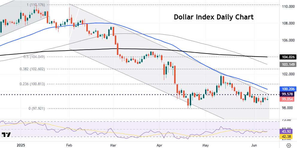 It seems the full impact of tariffs may not be felt in inflation until the summer and July and August data. Price pressures seen then may mean the Fed sits on its hands for longer and prevents officials from cutting rates well into the final quarter of the year. Of course, a hotter report would spark concerns and should underpin some support for the greenback. The three-year low in the Dollar Index sits at 97.92. With prices still in the long-term bear channel, resistance comes in at the 50-day SMA at 99.45, which has capped the upside previously. To change the trend, it looks like prices would need to get above the mid-May high around 102.