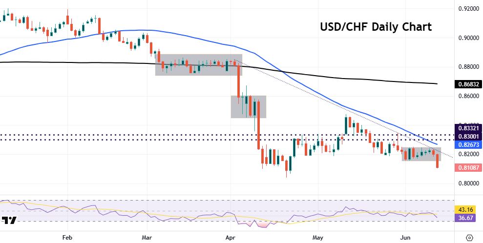 So too the April 10 move lower which took prices crucially below the 2015 long-term low at 0.83 and another trough from December 2023 just above here. More recently, yesterday’s breakdown after very tight, sideways trade saw prices move closer to the late April low at 0.8043. This is major support as there is no big level after this until 2011 lows around 0.77.