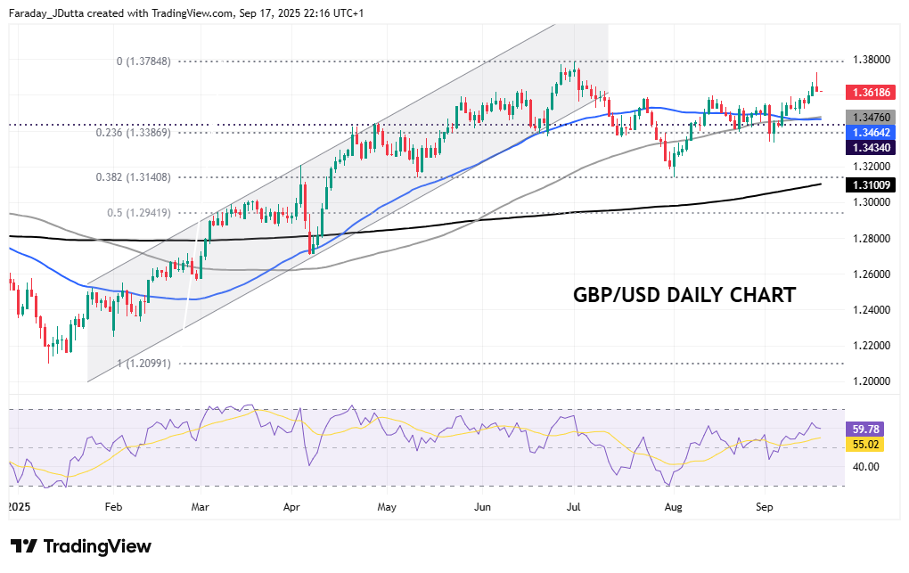 FX: USD whipsawed after a volatile day which saw fresh multi-year lows after the FOMC statement release to 96.21. This was on the back of the median dot plot for this year adding in another 25bps of cuts, so two more moves, an additional one for 2025 since the June meeting, and more in line with the 70bps of cuts markets priced in before today’s decision. The language was also tweaked highlighting increased risks towards the job market. But it was a confusing picture with the dovish dot plot conflicting with higher inflation and some labour dynamics. The more hawkish Powell press conference saw bargain hunters step in as the Fed Chair said policymakers don’t need to move quickly on rates and the cut was actually a ‘risk management’ one. The Dollar Index closed above the long-term upward trendline from 2011.