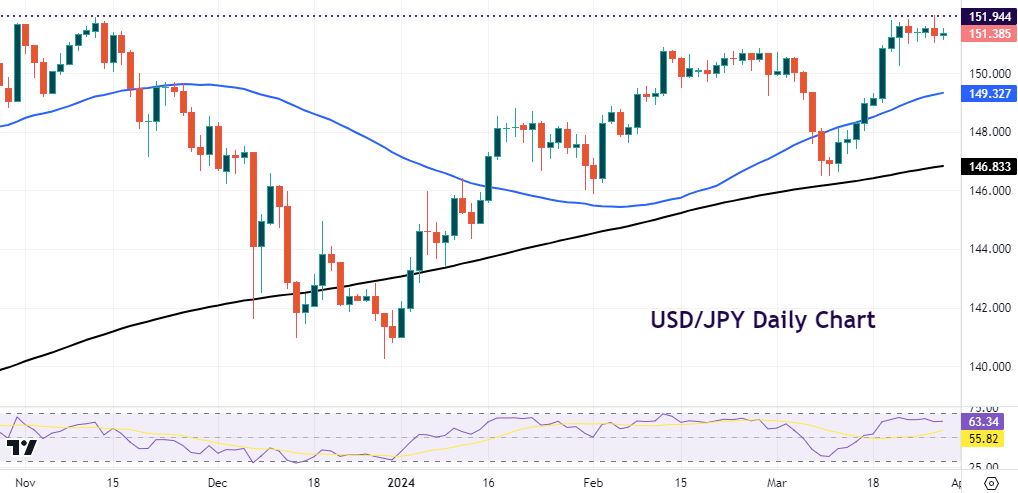 USD/JPY hit a multi-decade high on Wednesday at 151.97, a level last seen in 1990. Markets have been on high alert for intervention which previously came around here in October 2022. The Ministry of Finance sold $15-20bn initally in September of that year and a total of around $70bn over two months. Remember that officials check the rate of change more than levels.