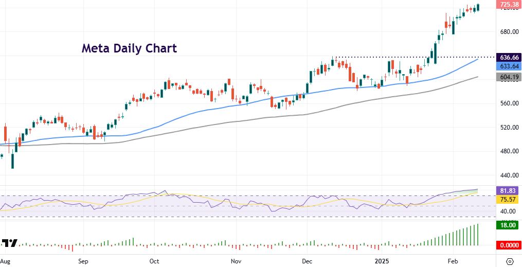 Recently, it printed record intraday highs last Thursday at $718.90. This run comes on the back the DeepSeek news and cheaper AI which is great news for Meta. Open source will also do well, the company is expanding the use of its in house chips, while the company has got leaner in recent days, after the announcement that they have laid off 5% (4,000) employees. This is aiming to improve operational efficiency and across several regions.