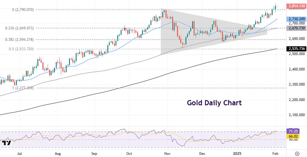 We wrote just over two weeks ago about how gold was breaking out of a bullish consolidation pattern and would likely make fresh record highs. It’s been a textbook move higher with minor flag patterns and further upside. Safe haven demand has helped, while a dollar pulling back yesterday below previous cycle highs saw added buying in gold. China’s recent central bank buying is a long-term driver, which comes after a six-month pause. There are still roughly two Fed rate cuts priced in for 2025, with the first one set to kick off in July. The previous record highs at $2,790 could now act as initial support. The 21-day SMA sits at $2721, where the late November and mid-December highs reside.