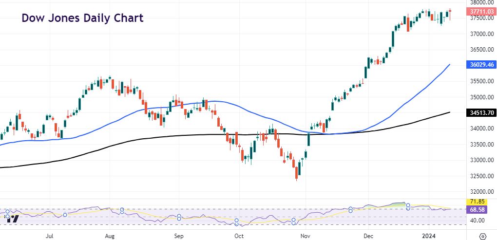 As we said yesterday, the longer prices track sideways in narrow ranges, the bigger the breakout and range expansion will eventually take place. This is generally in line with the dominant long-term trend. The Dow made all-time highs at the end of last year and the very start of 2024. Since then, prices have traded in a relatively narrow range between support at 37,250 and 37,800 more or less.