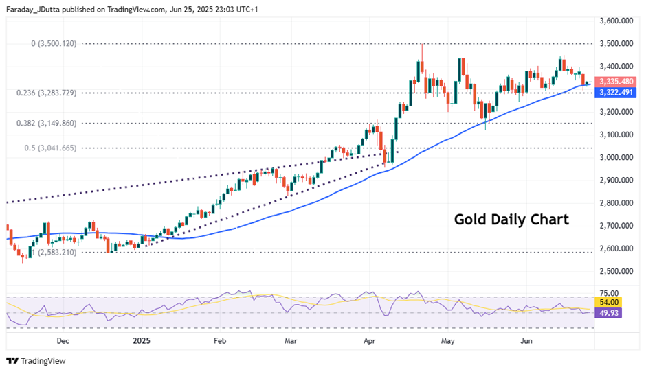 Gold steadied after a sharp sell-off on easing geopolitical concerns around the Middle East. Support has been found at the 50-day SMA at $3,322. See below for more.
