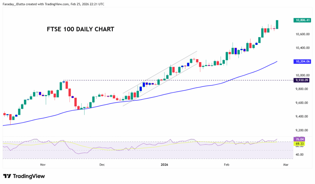 The UK’s FTSE 100 continues to outperform other major indices. It’s up over 8.8% in 2026, versus a marginally positive S&P500. UK stocks still trade on lower valuation multiples and higher dividend yields than many US peers, anchoring steady returns. Of course, the sector mix is currently a big advantage as the index has a heavy weighting in energy, commodities, finance and defensives, all sectors which are rallying globally. The FTSE 100’s composition is a boon during rotations away from tech-centric leadership. The rate outlook and incoming inflation relief have also kept prospects of BoE rate cuts solid, with easing inflation trends buoying confidence in UK equities relative to US markets.