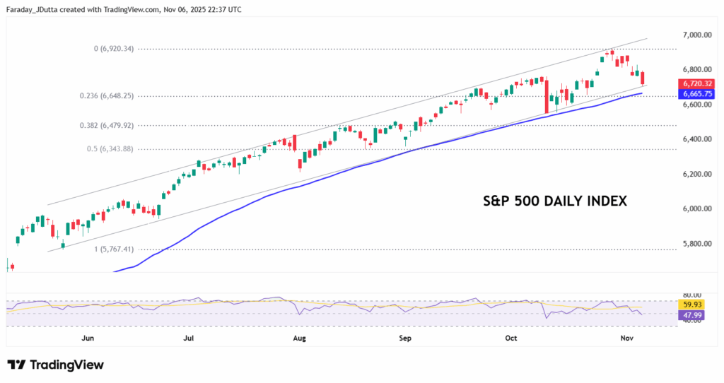 US stocks: The S&P 500 lost 1.12%, closing at 6,720. The Nasdaq moved lower by 1.91% to settle at 25,130. The Dow Jones finished at 46,914, down 0.84% on the day. Only two sectors were green – Energy and Healthcare with Tech and Consumer Discretionary the biggest losers. Lots of stories and narratives as Nvidia CEO Huang warned that China could win the AI race against the US, while the OpenAI CFO spoke on a government backstop for its USD 1tln expansion; however, this was later walked back. CEO Altman also later clarified that they do not have or want government guarantees for OpenAI data centres.  Tesla shareholders overwhelmingly backed CEO Elon Musk’s $1tn pay package hoping that the chance of a huge payday, the biggest in history will push him into focusing on the EV maker.