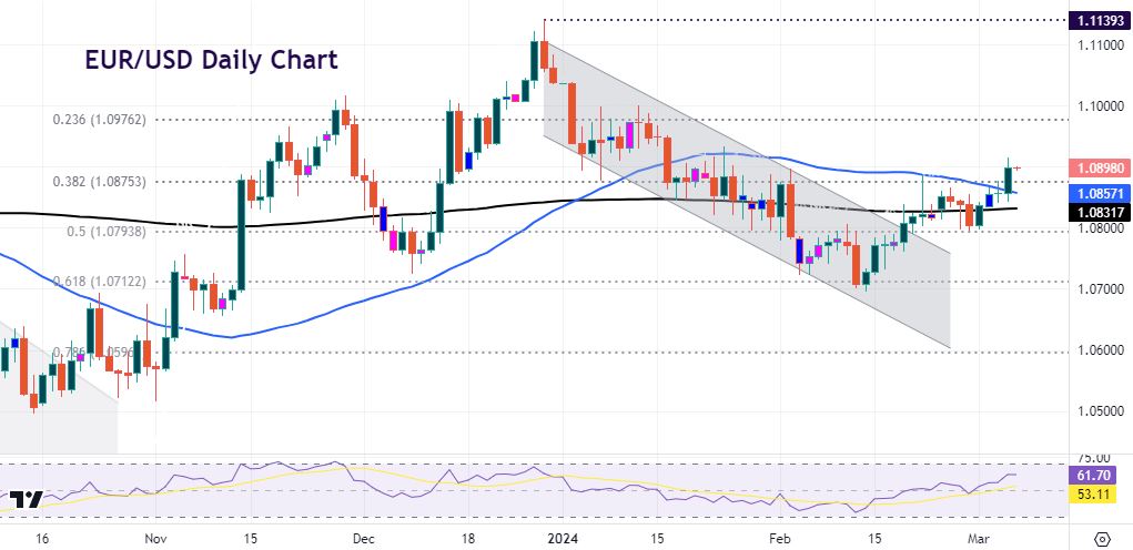 The techncial trend in the world’s most popular currency pair remains positive. After breaking out of the two-month bear channel in late February, prices had been trading around the 200-day SMA at 1.0831 and supported by a major Fib retracement level at 1.0793. Yesterday’s upside break took the major beyond the next big Fib level and 50-day SMA. A sustained push above here could see more euro gains towards 1.10 if Lagarde is more cautious about rate cuts. Any solid hints of policy easing might see prices fall back towards1 .0850 and below.