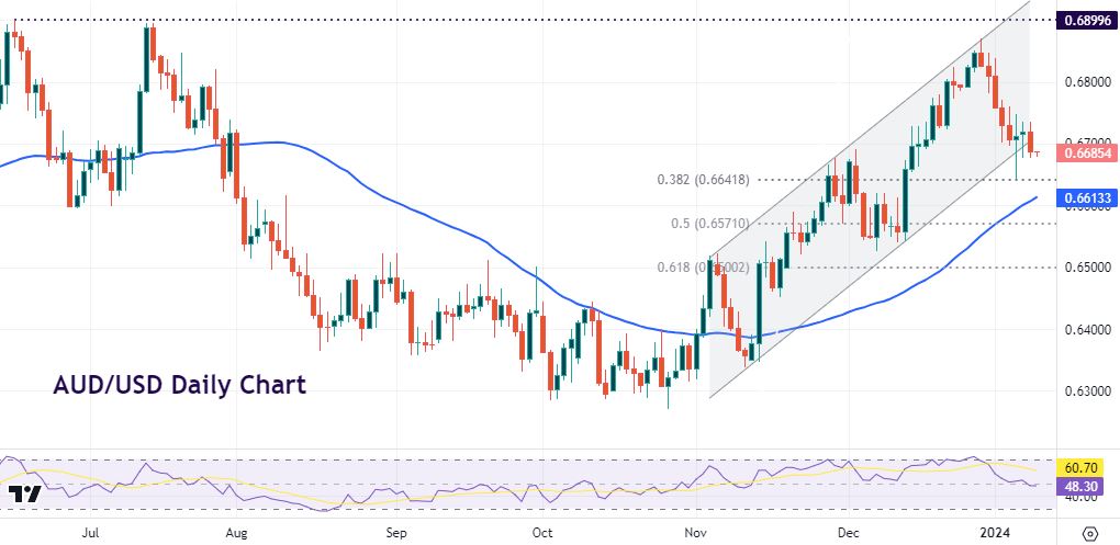 AUD/USD dropped to a 12-month low in late October at 0.6270. Since then, prices pushed higher in an ascending channel until the top late last month at 0.6871. Long-term resistance was seen above here, with the peaks from June and July last year just below 0.69. The major sold off through to the start of this year with prices dipping to a major Fib level of this move (38.2%) at 0.6641. Below here is the 50-day SMA at 0.6613, with the pair just currently edging out of the bull channel.