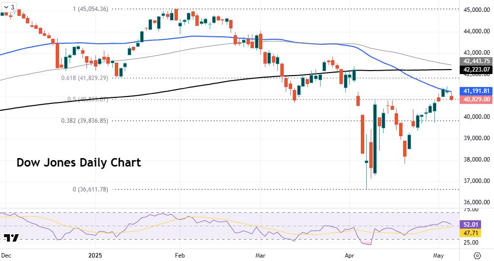 The rebound has been impressive since the tariff meltdown in early April. The “melt-up” has seen gains of more than 11% after the spike low on Monday April 7 at 36,611. That level is now a big ‘line in the sand’ for any move lower. Prices have moved up to the halfway mark of this year’s high to low move at 40,833. The 50-day SMA has also now capped the upside, at 41,191. If bulls can get past this area, the next major Fib level (61.8%) sits at 41,829. The 200-day SMa resides above at 42,223.