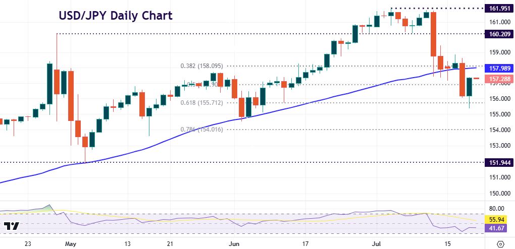 Prices have dropped sharply from the early July and multi-decade peak at 161.95. They found support around 158.09 before falling to a major Fib level (61.8%) of the May low to July high move at 165.71. The major bounced off here back above the 50% mark at 156.90.