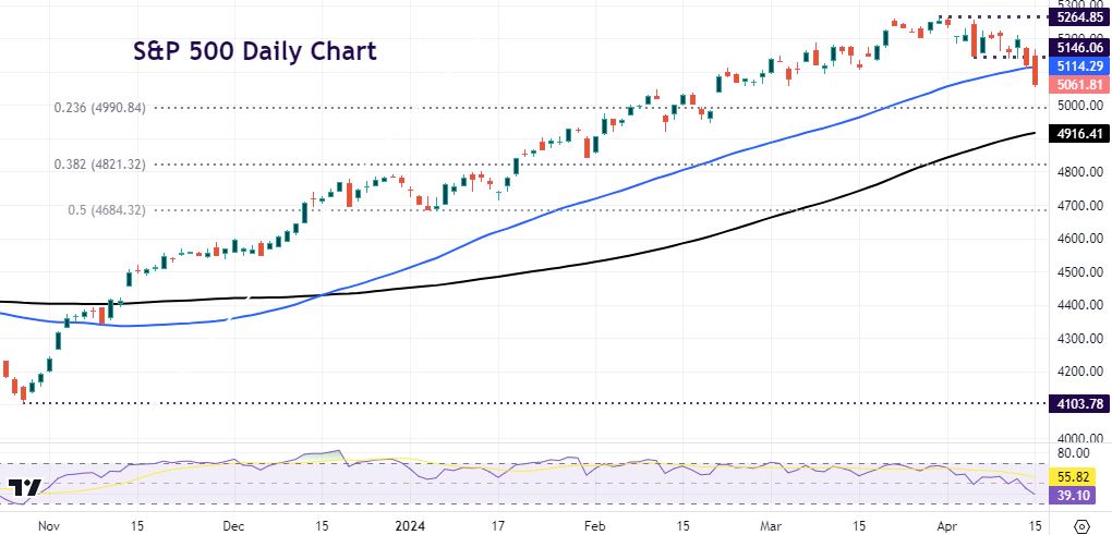 Technically, the benchmark index has broken down through near-term support at 5146. Prices also fell through the 50-day SMA at 5114. The first retracement Fib level of the October 2023 rally sits at 4990. The 100-day SMA is at 4916.
