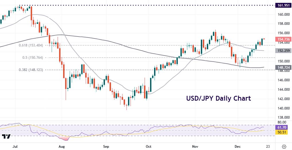 USD/JPY moved higher as it nears the November top at 156.74. The 10-year US Treasury yield surged up tot levels above 4.5% last seen in May. Focus turns tot the BoJ meeting who are expected to sit on their hands at their final meeting of the year ahead of a rate hike early in 2025.
