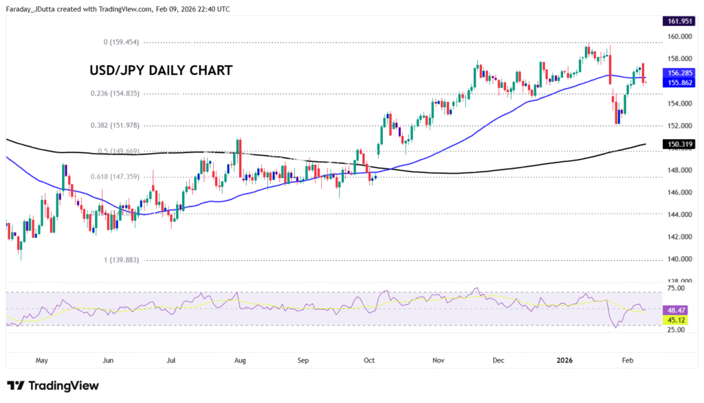 The yen has surprised many, including us, by gaining after the resound victory by PM Takaichi. Consensus had been that a big LDP win would trigger a large sell-off in both Japanese Government bonds and JPY, as an unchecked LDP would push ahead with unfunded fiscal giveaways and lean on the Bank of Japan not to tighten. But Takaichi has struck a remarkably measured tone, seeking to assure markets on her fiscal plans by arguing that the temporary tax cut on food would not require the issuance of fresh debt. Maintaining stability in the government bond market is key though many observers think Abenomics 2.0 means Japan is about to run the economy hot. Interestingly bets on an April BoJ rate hike now sit at 60%. For USD/JPY, today’s engulfing outside reversal is bearish and seen prices fall below the 50-day SMA at 156.29. The gap window that opened in the recent supposed intervention period in the mid-155s is important for more downside. The big resistance zone resides around 159.