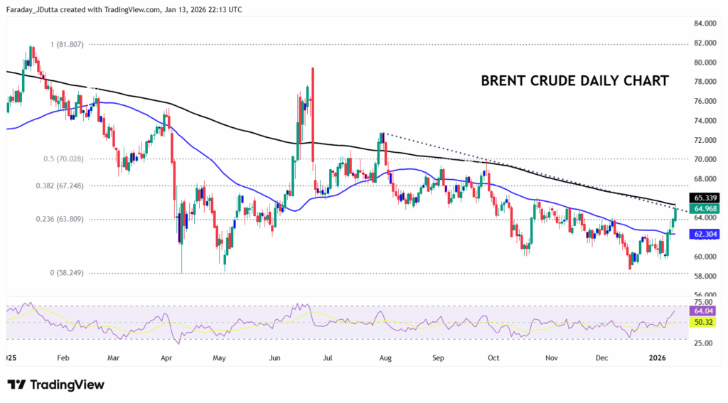 Brent crude spiked higher yesterday on news that President Trump had cancelled meetings with Iran and ‘help was on its way’ to the protesters. President Trump also announced a 25% tariff on countries trading with Iran, targeting China as a major oil buyer. It is uncertain whether this threat will deter China from purchasing Iranian oil. Chart wise, prices dipped to levels last seen in May last year in mid-December. But that zone was a long-term support area around $58 which stayed strong and held. Since then, prices steadied above $60 before enjoying a strong push higher through the 50-day SMA at $62.30, which had previously capped the upside from August. We’ve now reached the 200-day SMA at $65.30 with the major Fib level (38.2%) of the 2025 high to low at $67.24. The price increase coincides with the growing protests in Iran and possible US intervention.
