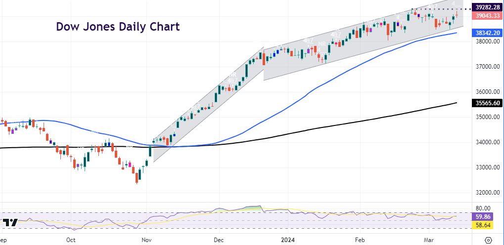 The Dow Jones Industrial Average remains in a bull channel, though less steep than the uptrend in the last couple of months of 2023. More recently, equities have been choppy with the mixed CPI data adding to the environment with higher yields. The benign inflation outlook is combining with the ongoing AI-frenzy/ That means high volatlity in some single names – witness the 11% intraday swing last week in Nvidia, the third biggest company by market cap.